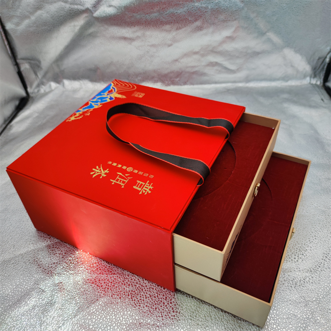 產品介紹: 名稱:黑茶紅茶禮盒 盒型:雙層抽屜盒 材料:灰板紙、特種紙 這是一款高檔茶葉精裝盒,采用觸感紙燙彩金,內容可以定制。采用雙層抽屜設計加珍珠棉,內襯適用各種直徑茶餅。來長沙找我定制高檔茶葉精裝盒。